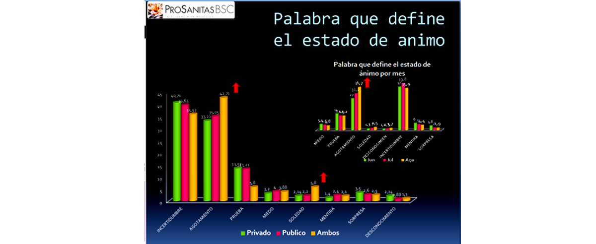 El grado de desgaste es entre alto y muy alto entre los encuestados de CABA y Prov. de Buenos Aires, jurisdicciones donde las dotaciones se encuentran presentes en un 60% en promedio asociado a condiciones insuficientes para sostener el nivel de exigencia al cual están sometido todo el equipo de atención directa de pacientes, los equipos de apoyo y el personal administrativo. En estas jurisdicciones el predominio de las respuestas a la palabra que define su estado de ánimo es AGOTAMIENTO, en más de un 37% seguido muy de cerca por INCERTIDUMBRE. SOLEDAD es la palabra que apareció en agosto en 3er lugar en particular para los médicos y enfermeros que trabajan tanto en público como en privado.